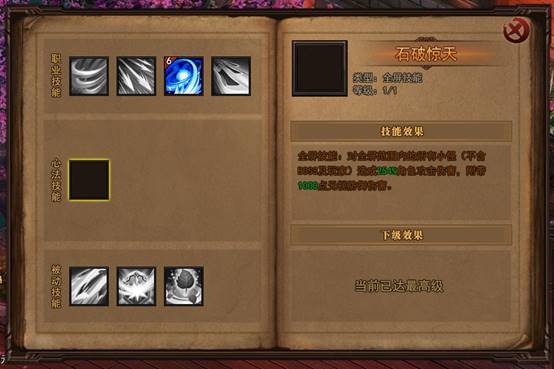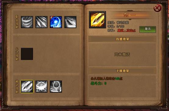 游戏中点击“S”键,可以快速打开技能界面。技能主要分为三类:职业技能、心法技能和被动技能。在游戏中获取“武功秘籍”后,可以激活相应的技能。